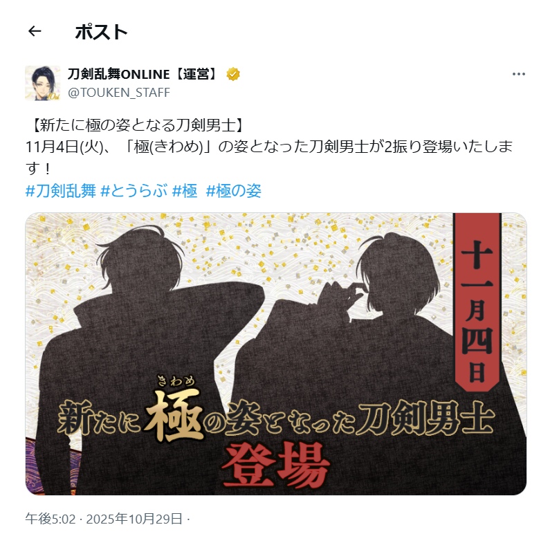 ってことは、ワンチャン、次の次の極解禁に肥前くんと南海先生がありえるってこと!?でも、うーん。正直、文久土佐の復刻は新しい刀剣男士の布石だと思ってるので、可能性はかなり薄そうなんだよなぁ。リアルイベントがあるみたいだし、さらに追加で江から五月雨と村雲か、実装順で言うなら、なーちりに抜かされちゃった祢々切丸かなーと思ってる。