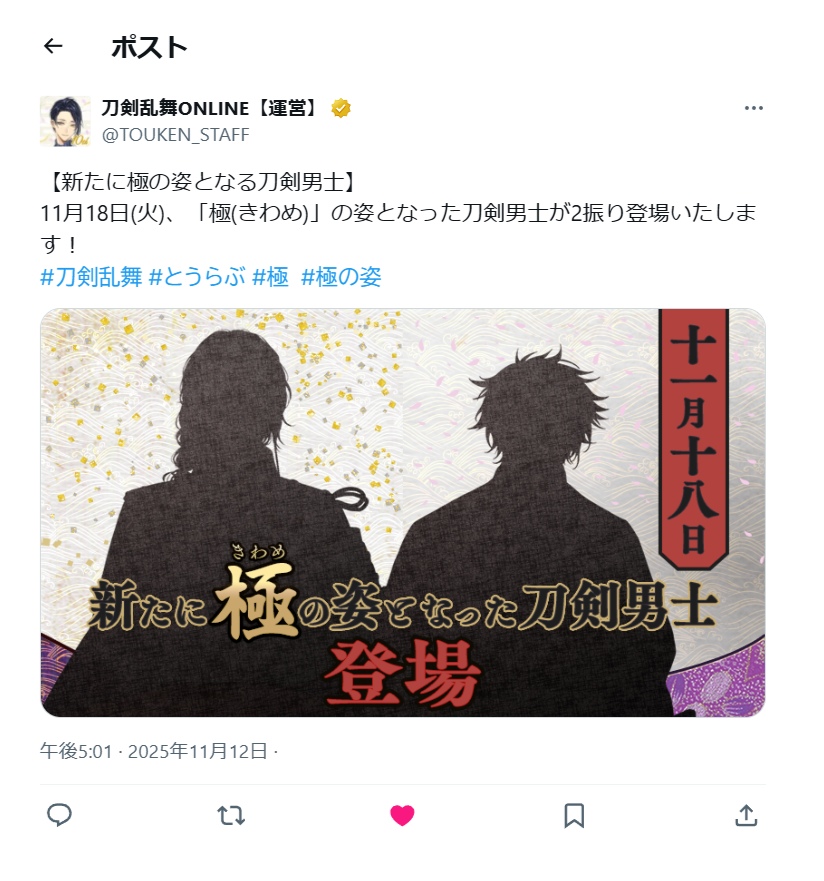新しい刀剣男士の布石じゃなかった!笑 嬉しすぎるー!初めて実装日に修行に送り出すことになりそうです。18日が待ち遠しい( ◜𖥦◝ )