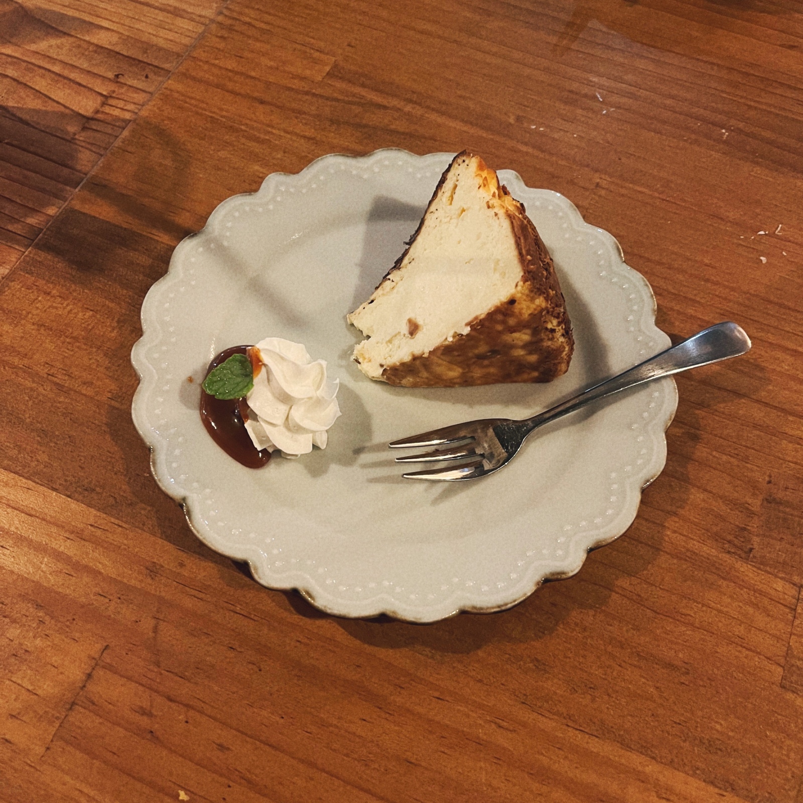 どのメニューも美味しかったけど、最後に食べたバスク風チーズケーキが一番の衝撃だった。マスカルポーネをそのまま食べてる?ってぐらい濃厚で、ぎゅ〜っと詰まったような食感と喉ごし。ちまちま食べないと、喉が詰まっちゃいそうだった。笑 めちゃ美味しかった。また食べたいな( ◜𖥦◝ )
